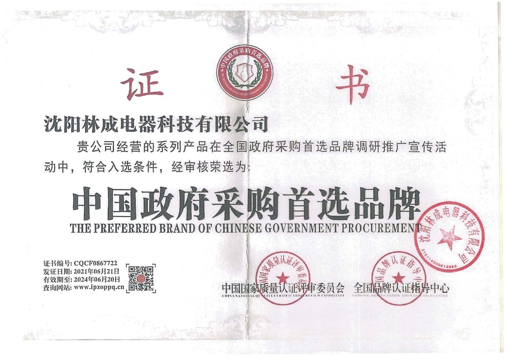 中國政府采購首選品牌證書